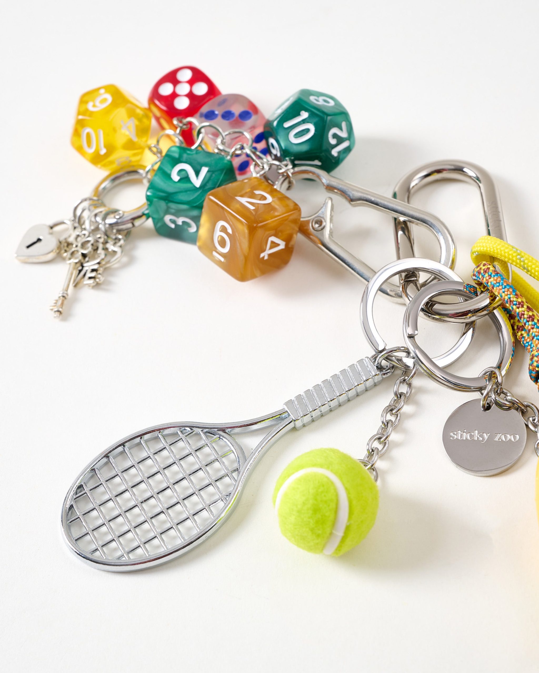| Materials | Resin dice, molded mini figure, faux tennis ball, woven cord |