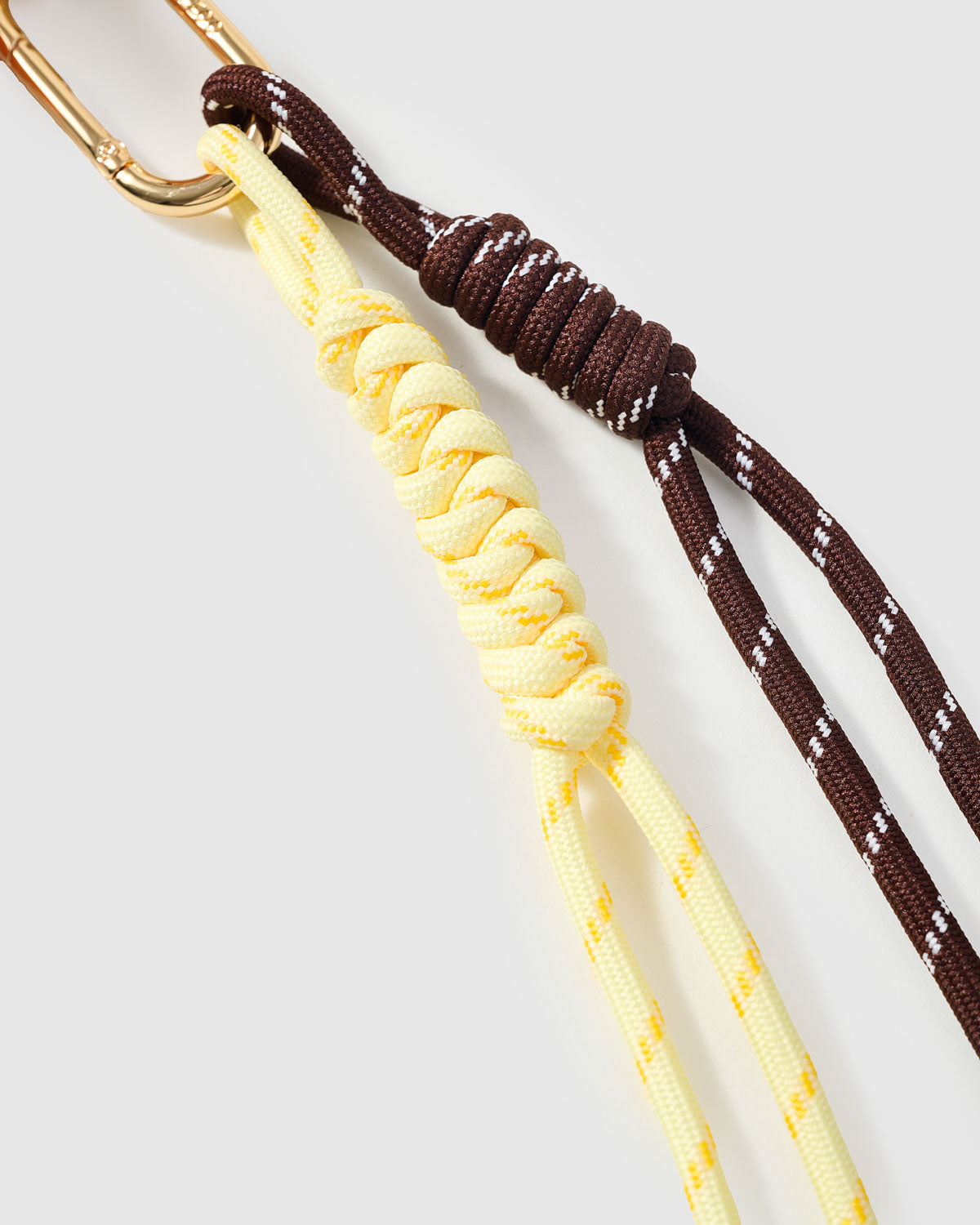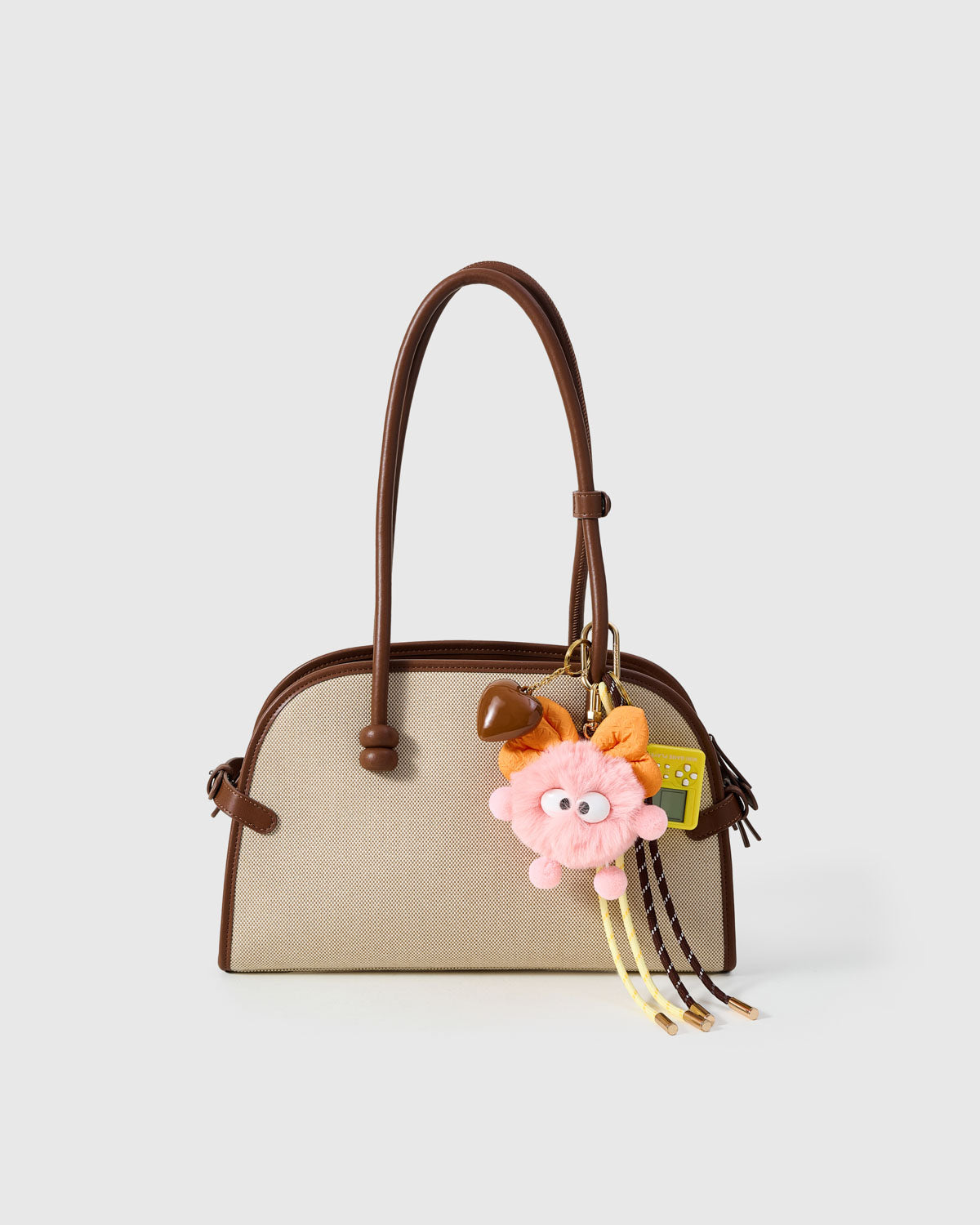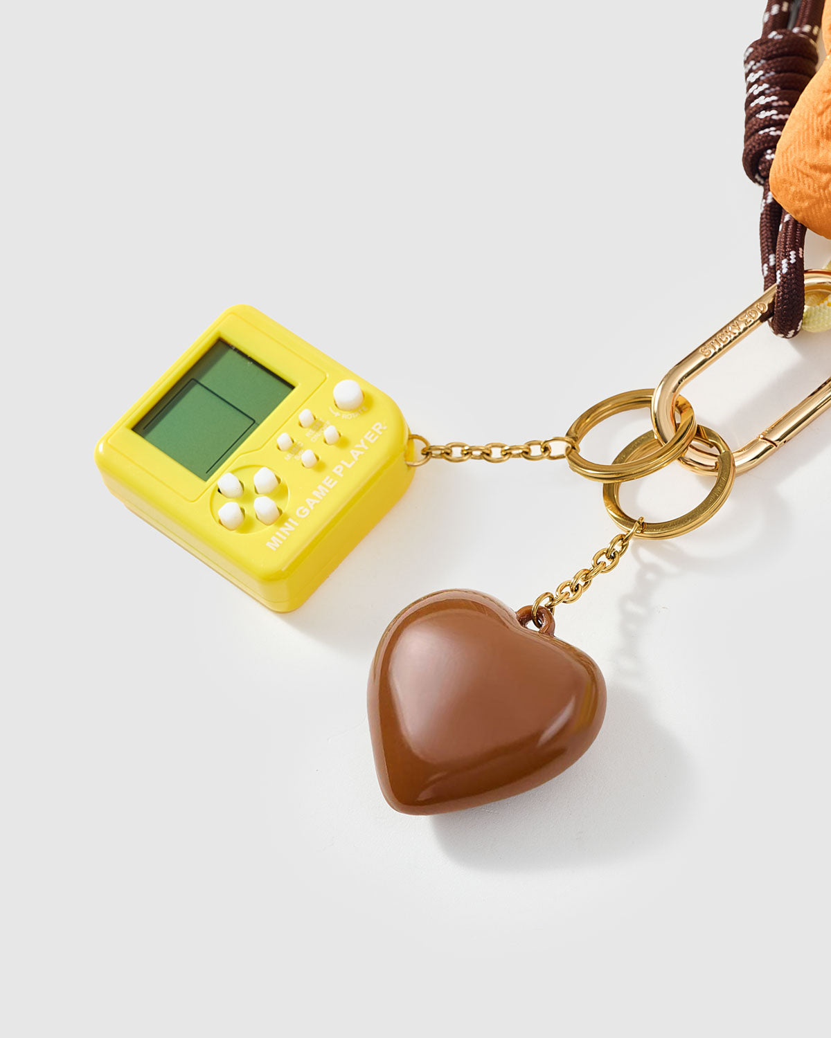 Materials Plush mascot; ABS mini game player; resin chocolate heart charm; braided paracord tassels (yellow & brown); 18K gold-plated hardware