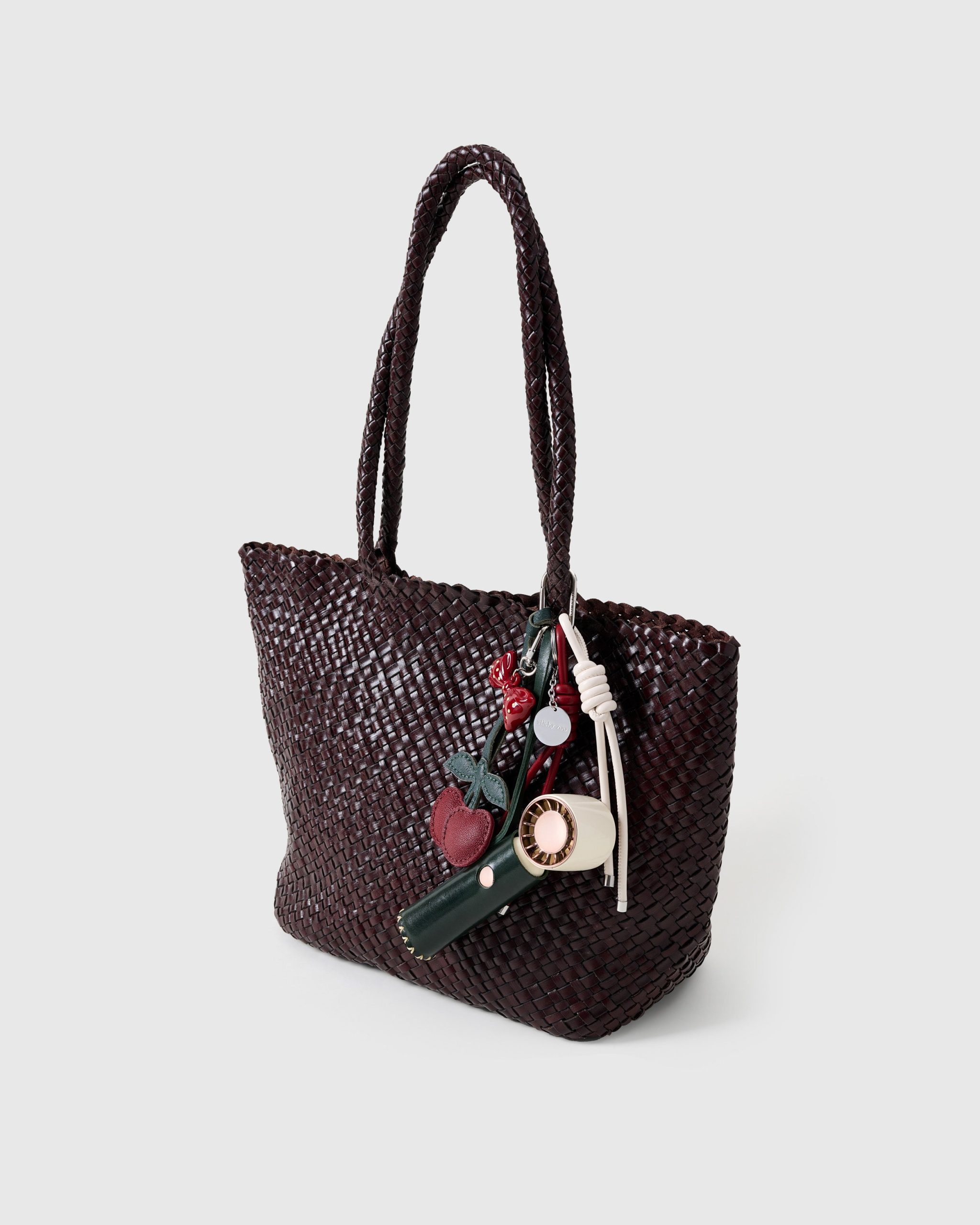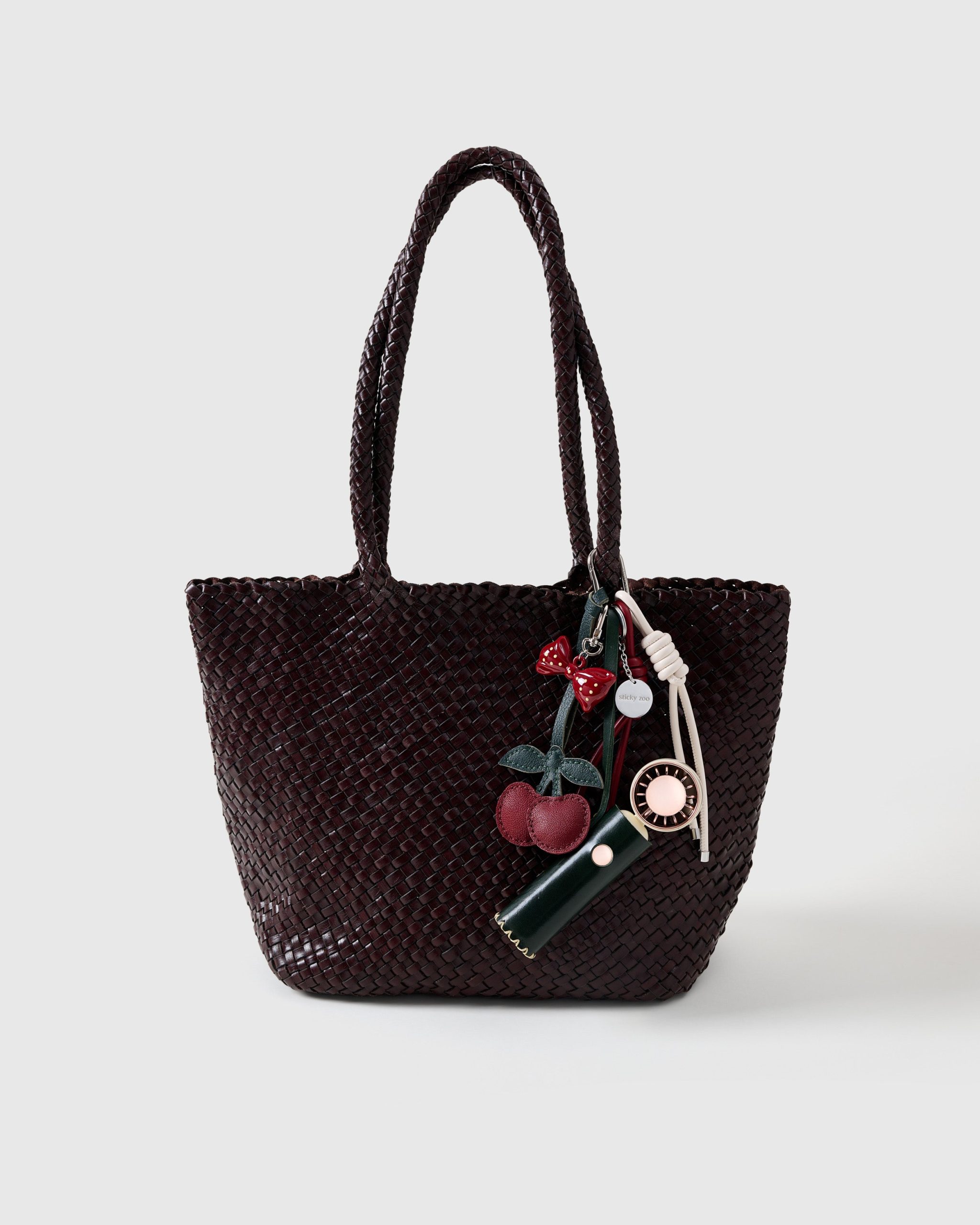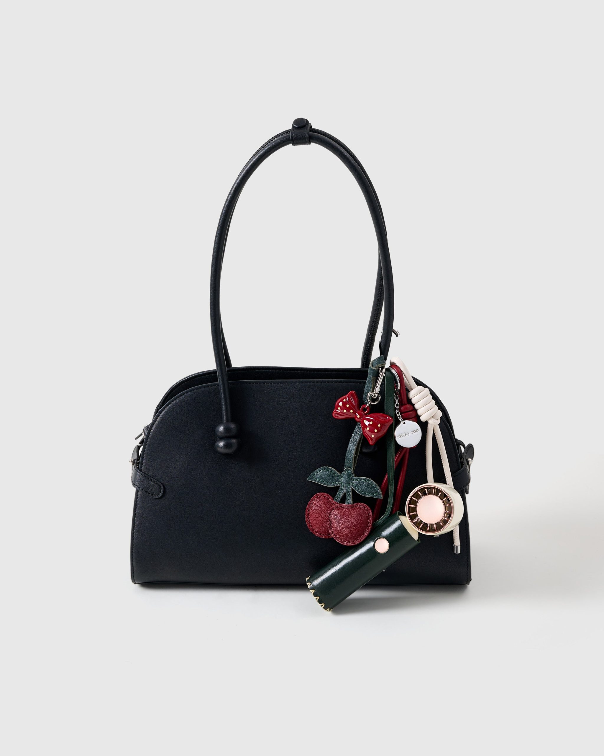 This one’s cherry-picked to perfection. The Cherry Charm – Cool Stack features a deep forest leather shell, glossy bow topper, and stitched double-cherry dangle for that polished-yet-playful vibe. But it’s not just a looker—hidden inside is a rechargeable, whisper-quiet mini fan (yep, really), perfect for heatwave commutes or glam breaks between snaps. Finished with vanilla and cherry red Sticky Zoo® ropes and a stainless steel hook engraved with our logo, it’s everything you didn’t know you needed, but now totally do.