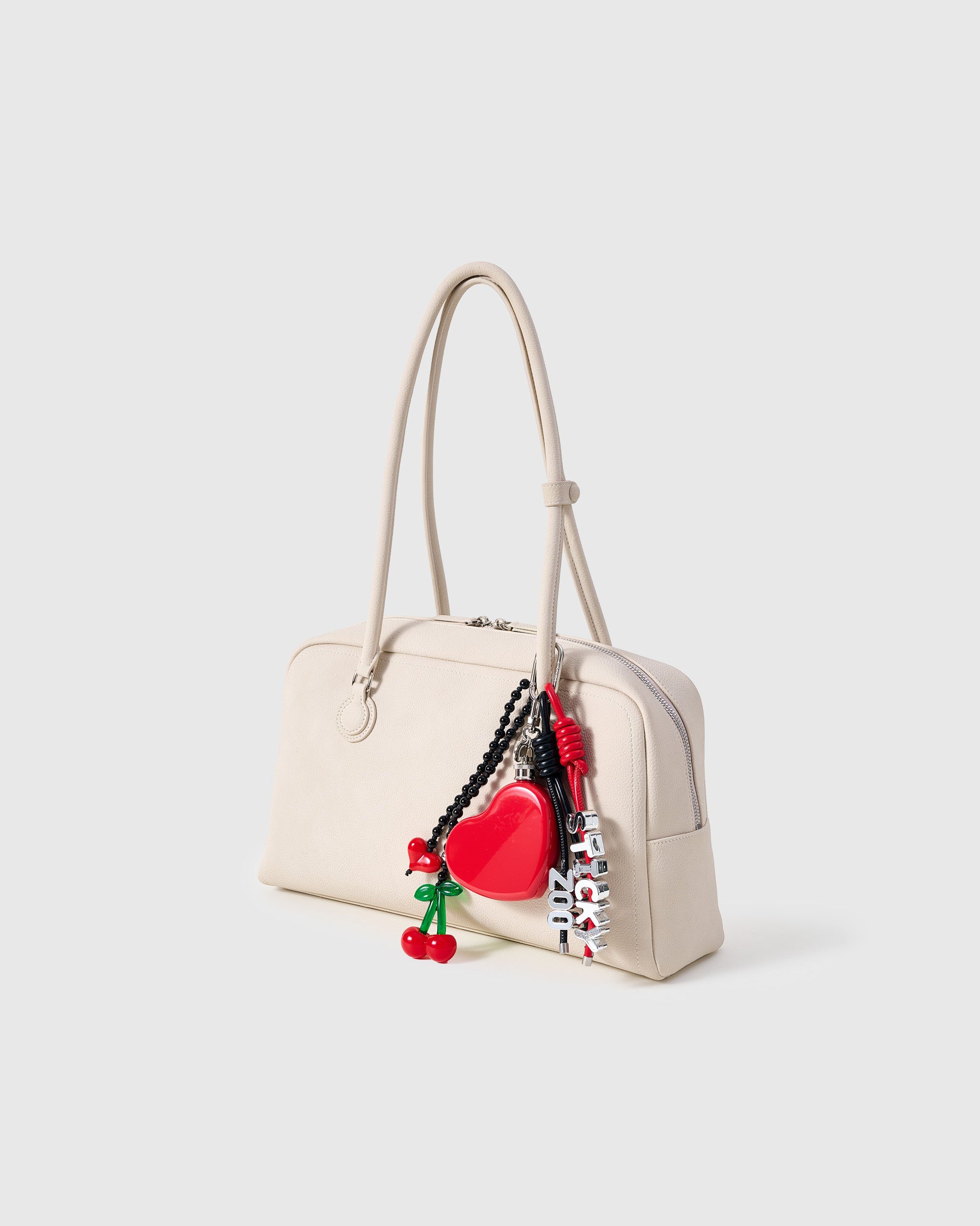 - Materials: Heart mini flask, cherry bead charm, chrome letters, vegan-leather ropes