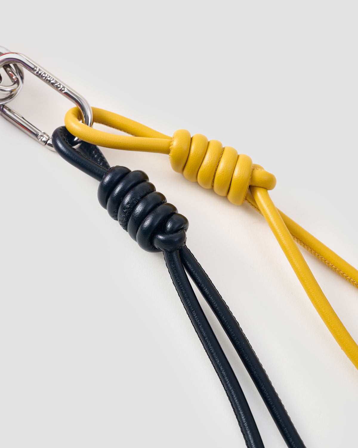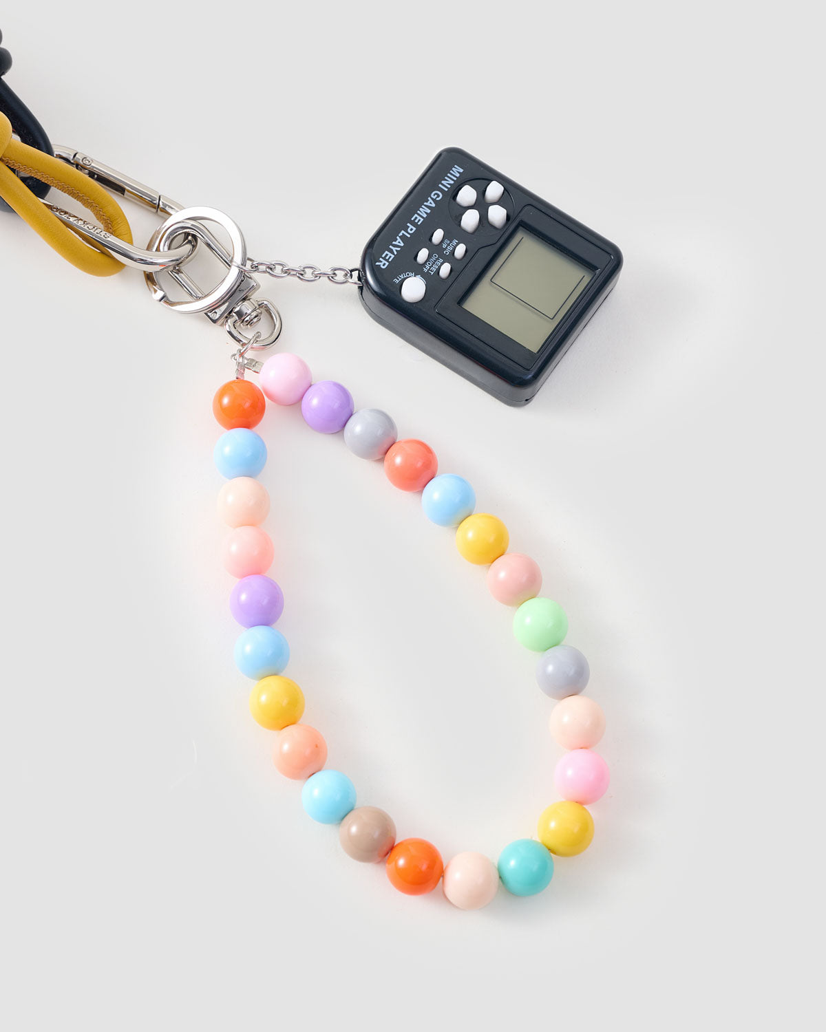 Materials Plush crab mascot; ABS mini game device; acrylic pastel bead loop; vegan-leather cords (mustard & black); stainless-steel hardware