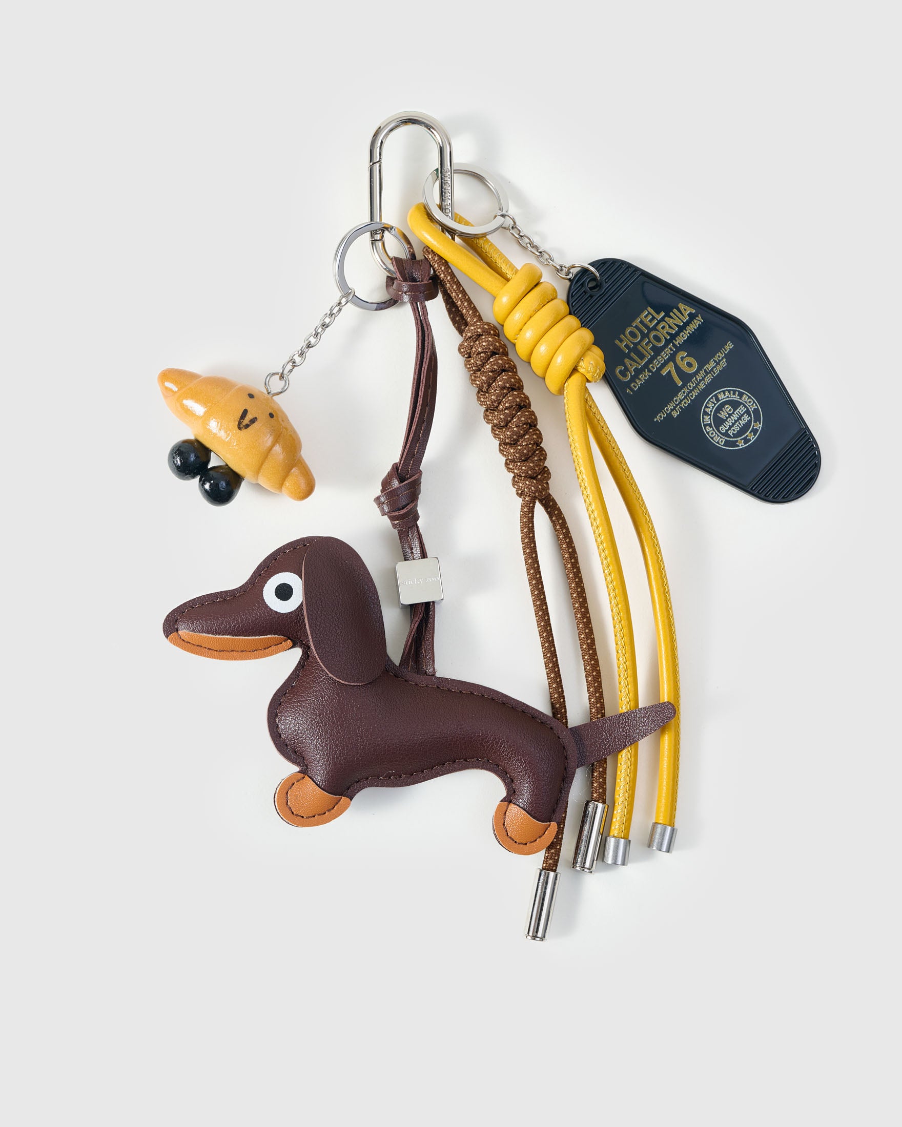 The Dapper Dachshund Backpack showcases an expressive dachshund face with detailed stitching, soft floppy ears, and rich faux suede textures. Paired with the handmade vegan leather Dachshund Charm, featuring a playful resin croissant charm, NYC hotel tag, and vibrant dual-tone cords. The charm attaches securely with premium 18K gold-plated hardware engraved with the Sticky Zoo® logo.