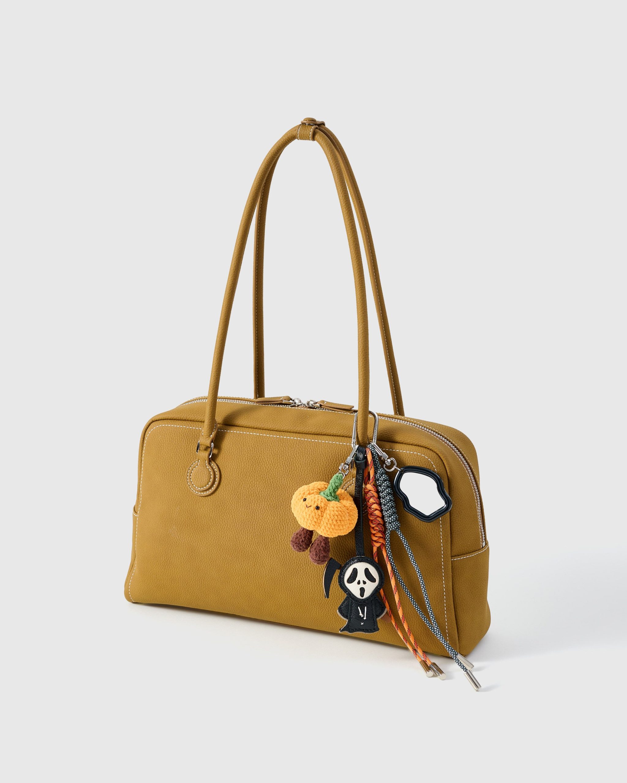 | Materials | Crochet plush pumpkin; French Alran leather reaper; acrylic mirror; nylon paracord; resin/glass beads |