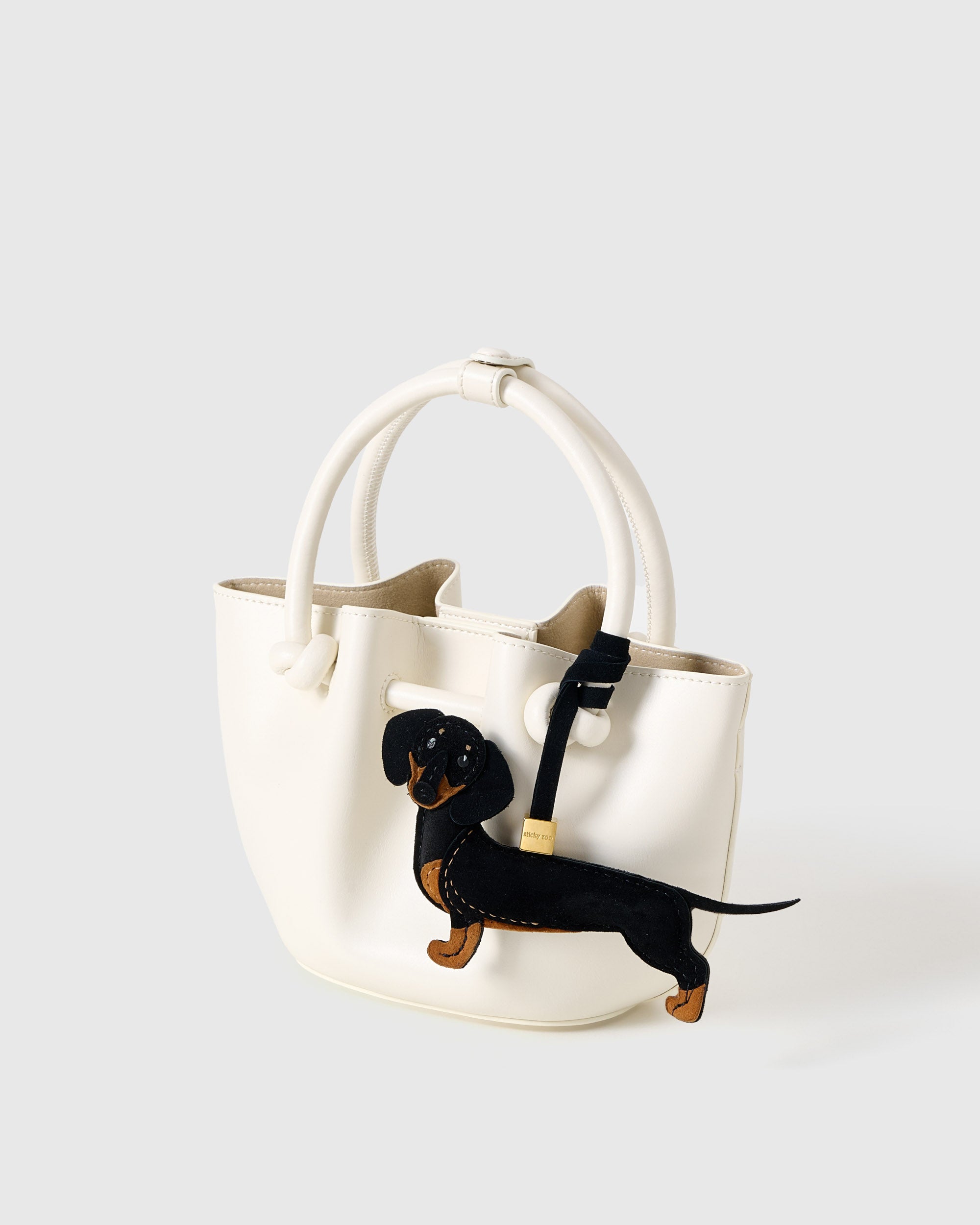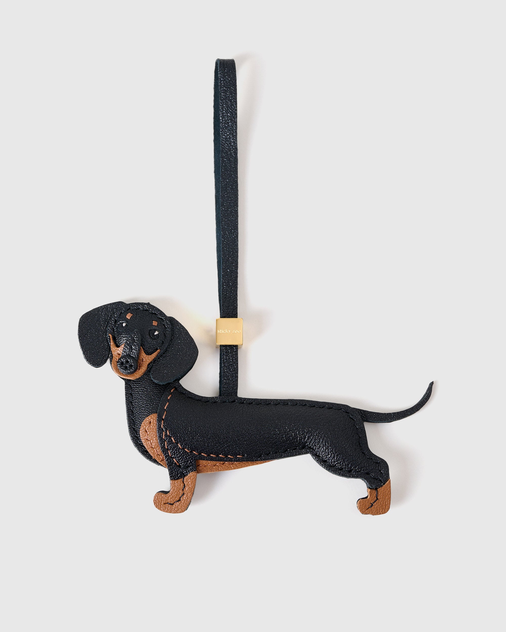 Dash is an icon in miniature. Whether clipped to your handbag or looped around your wrist, this long-bodied beauty brings timeless style and a hint of whimsy. His caramel paws, stitched brows, and glossy black nose add layers of handcrafted detail. Opt for the Leather Edition to highlight structure and gloss, or the Suede Edition for soft-touch charm with luxurious depth.