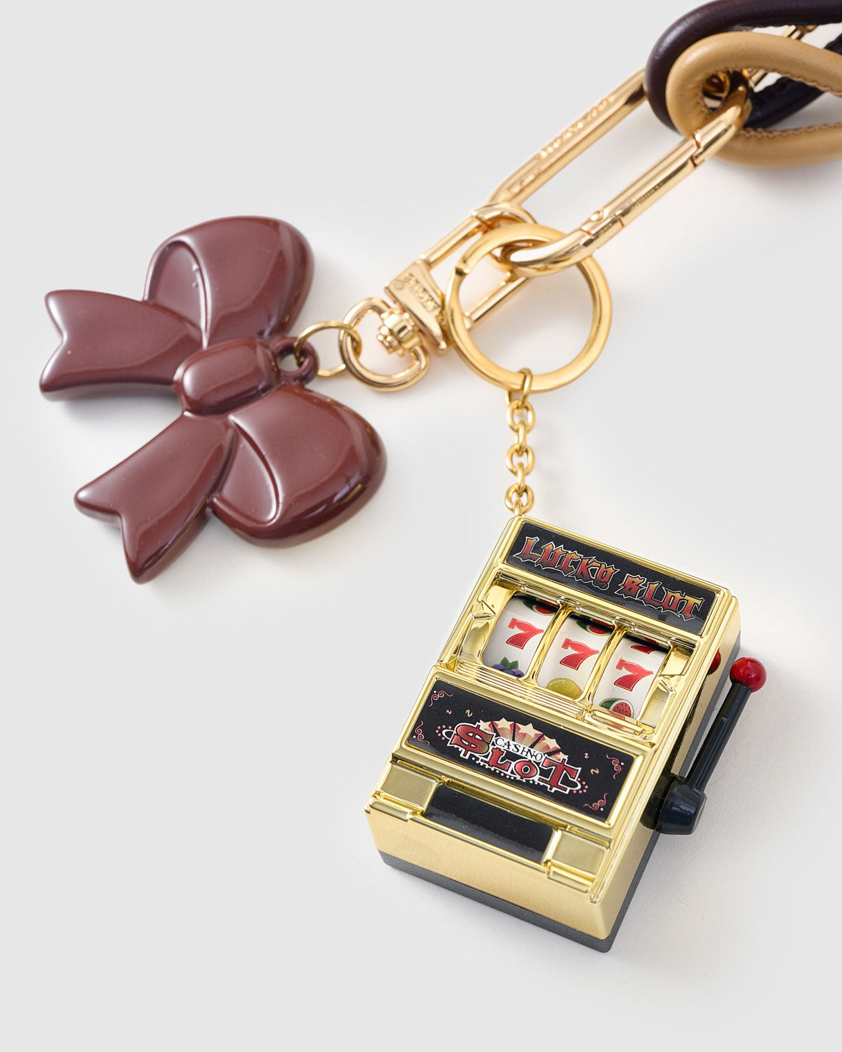 Materials Plush red panda mascot; resin bow charm; zinc-alloy mini slot machine; vegan-leather cords (brown & gold); 18K gold-plated hardware
