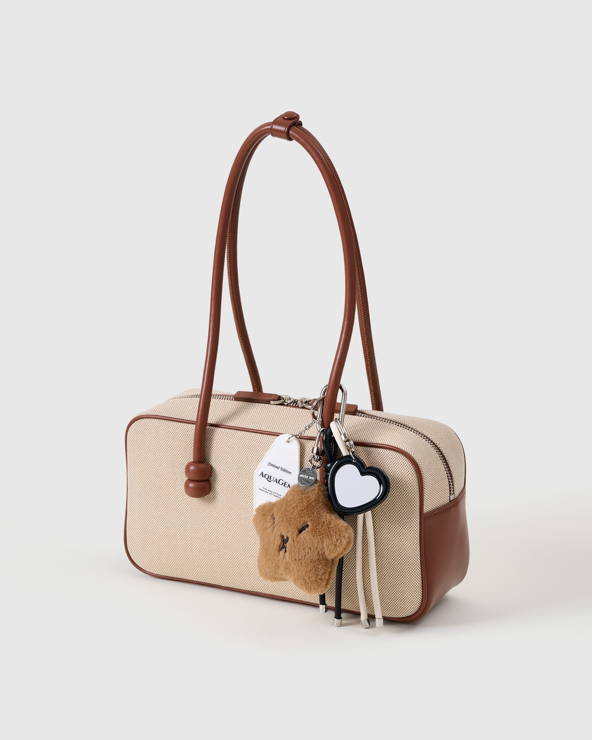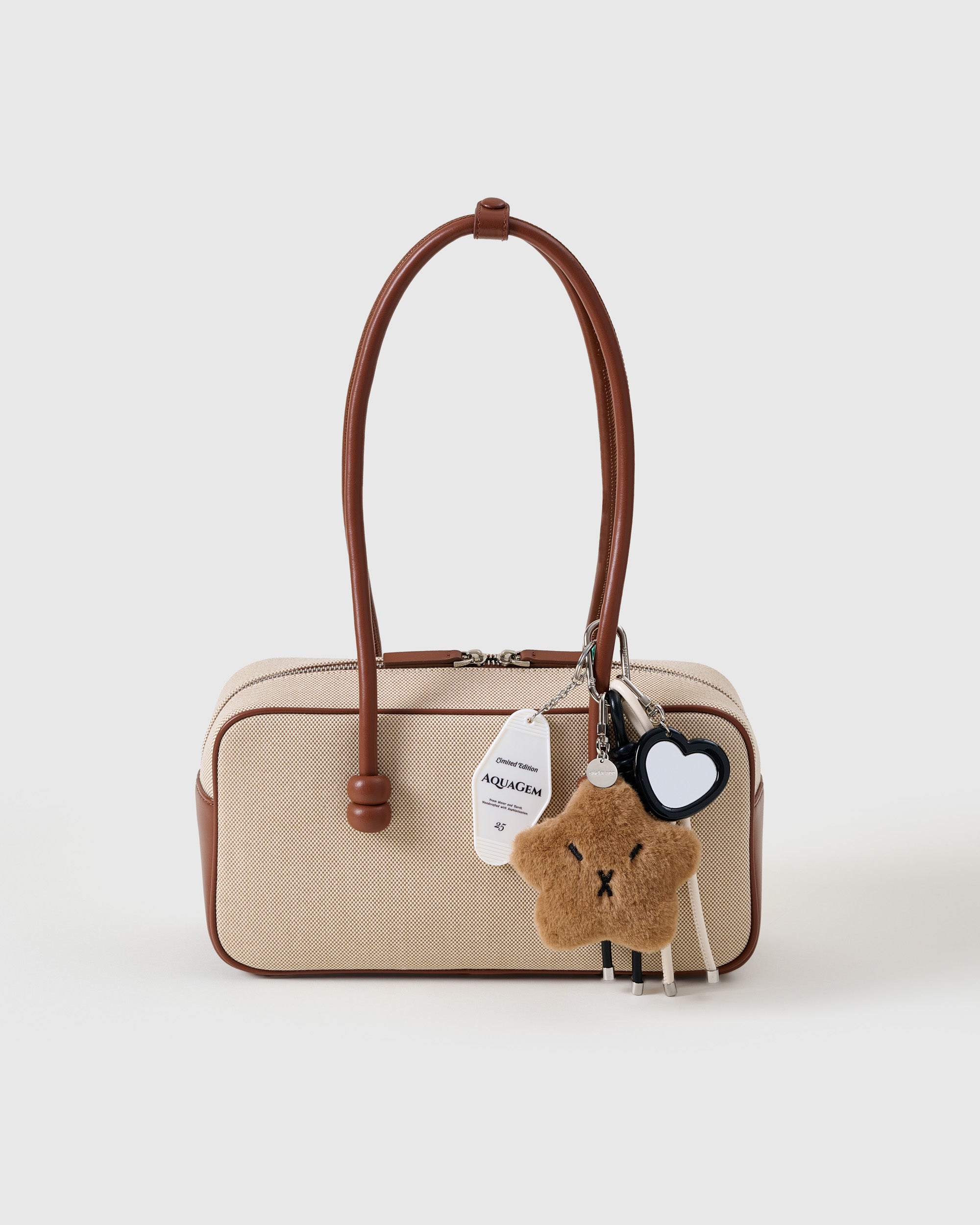 | Materials | Plush star mascot (mocha); acrylic heart mirror with glossy black frame; AQUAGEM motel-key tag (acrylic); vegan-leather rope cords (cream & black); stainless-steel hardware |