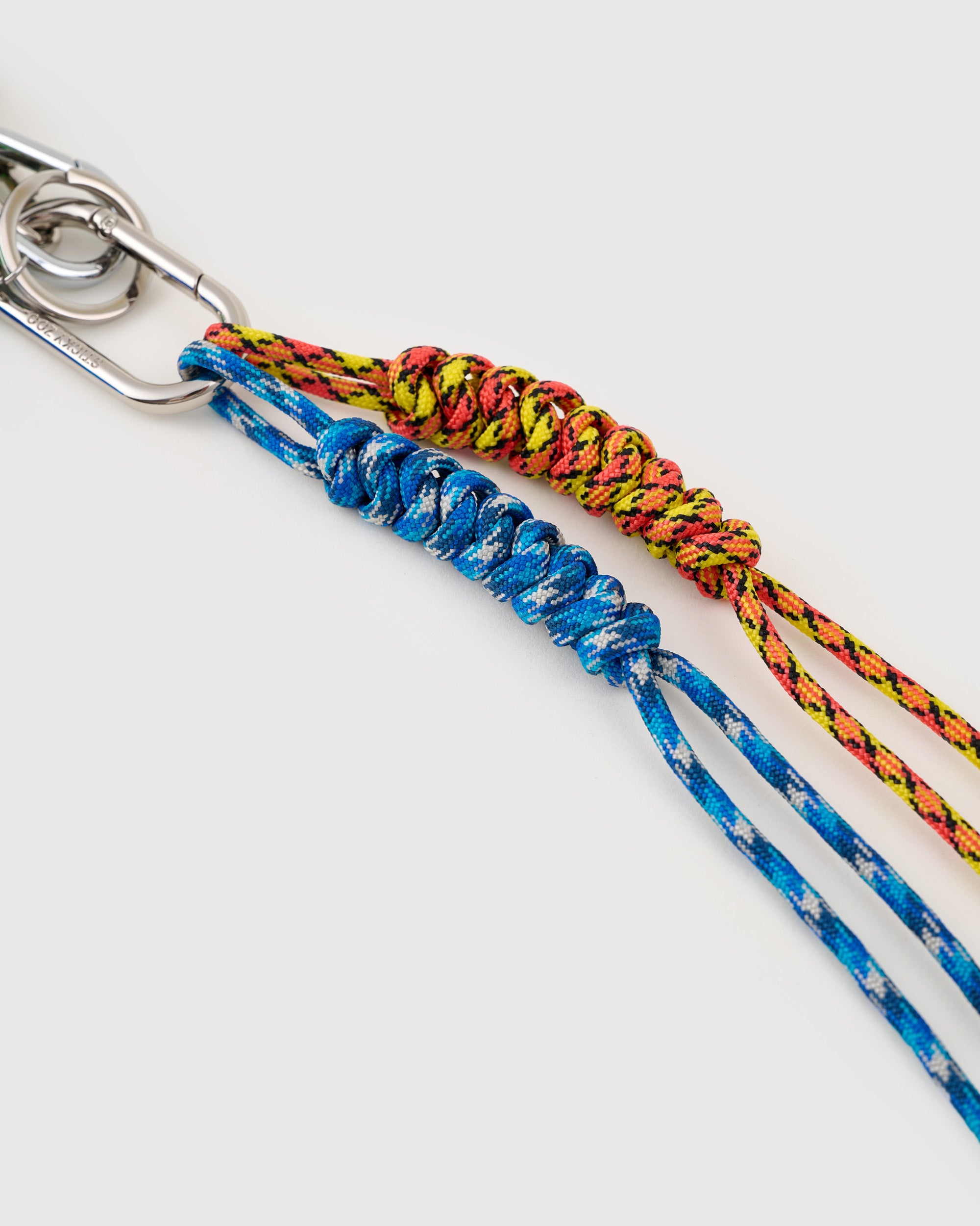 | Stack Elements | Rainbow D4 dice cluster, retro mini game keychain, braided cords (blue and red/yellow), polished stainless ring & carabiner |