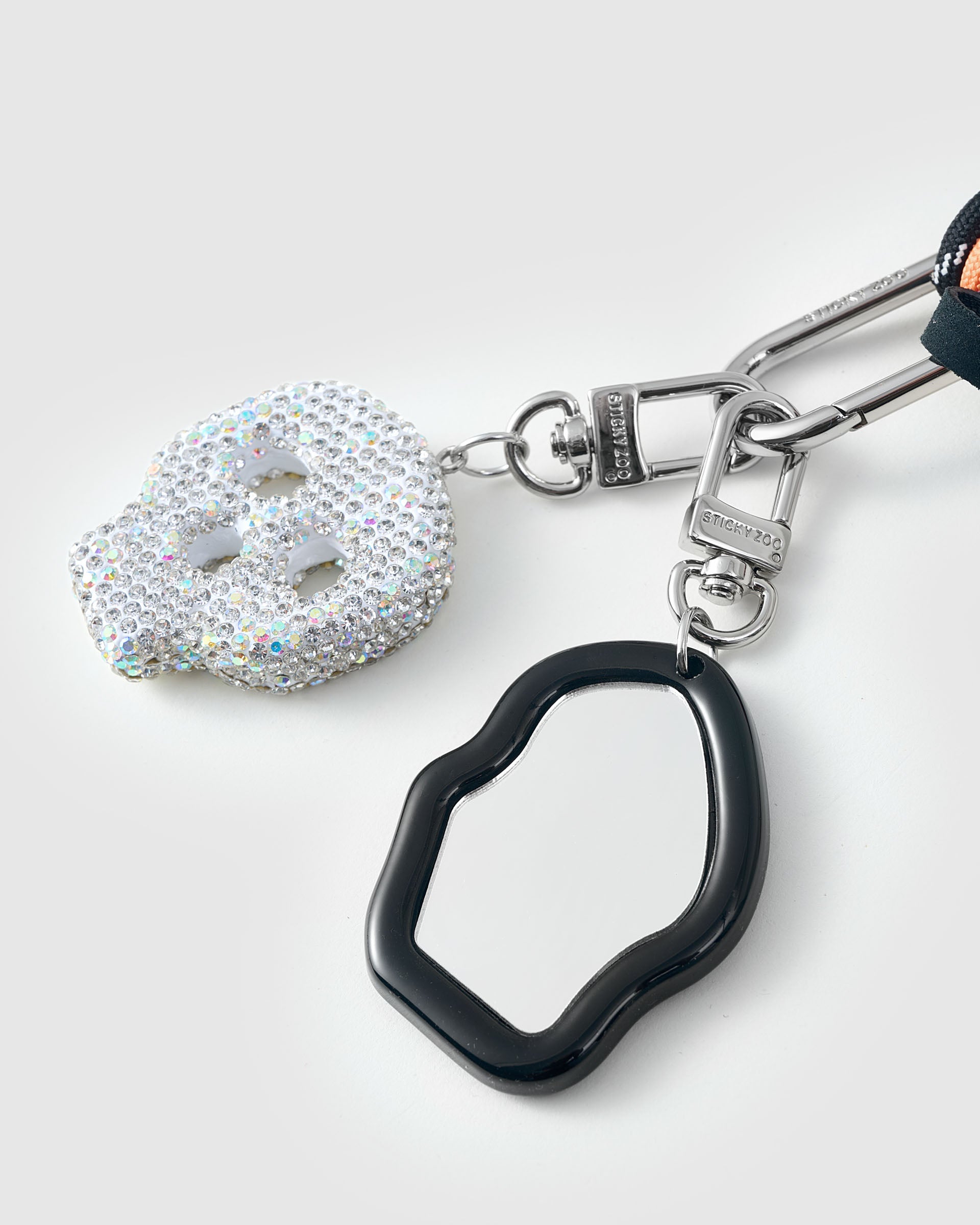 Playful. Collectible. A little haunted. The stack layers fine materials—edge-painted Alran leather, shimmering pavé, glossy ghost mirror, and tactile paracord—so your bag feels styled, not crowded. Clip it on and let the compliments follow you down the sidewalk.