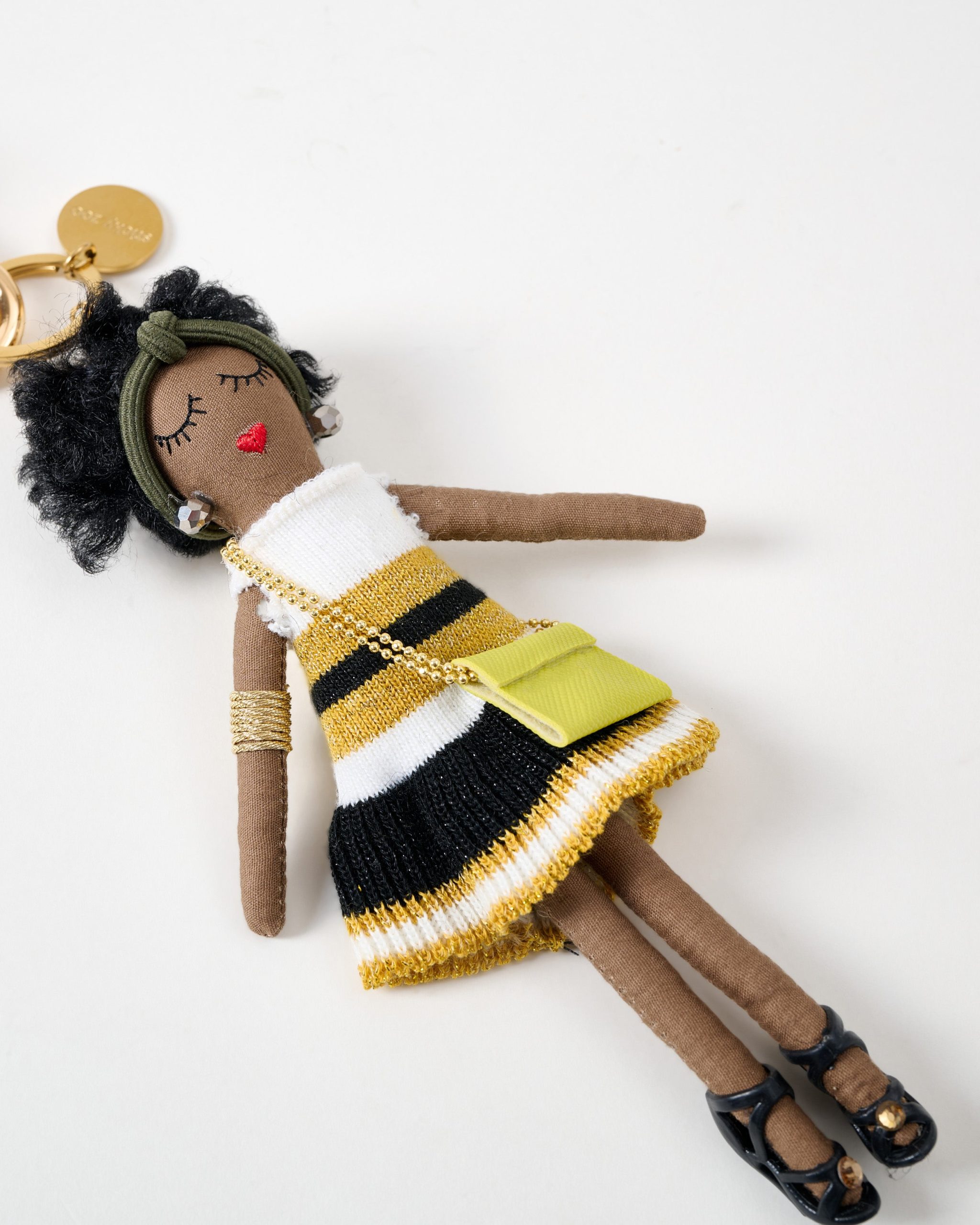 The SAINT IVY STACK CHARM from STICKY ZOO captures that golden-hour glow — modern, playful, and full of personality. Handcrafted in small batches, she features a chic yellow-and-black dress, a heart mirror accent, and gold-plated hardware that catches the light with every move.