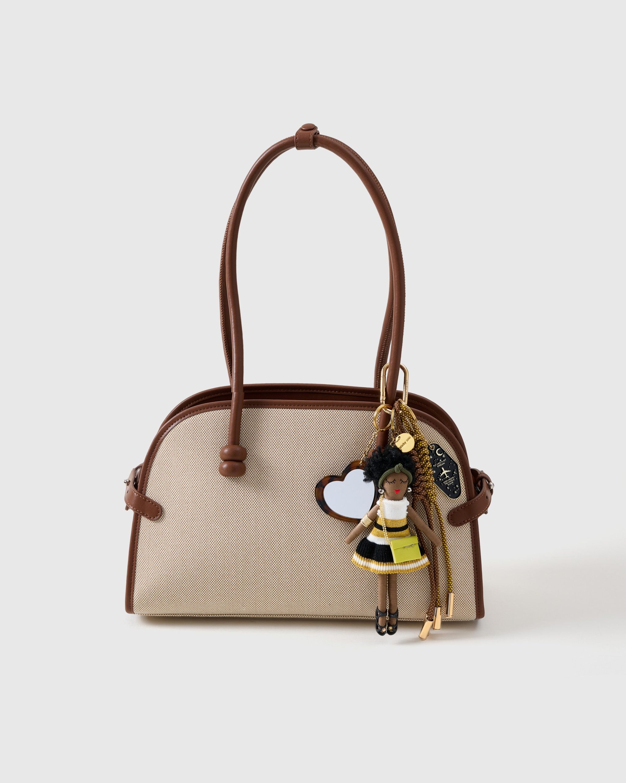 | Materials | Handmade fabric doll; heart mirror accent; gold-tone hardware; leather cords (caramel & honey) |