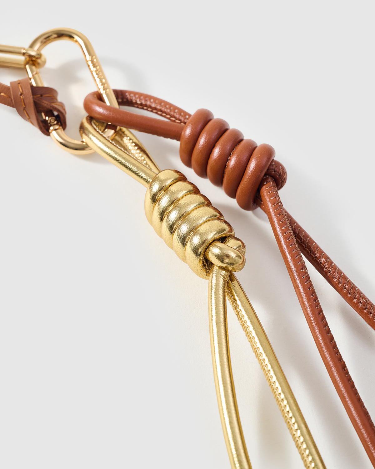 • Gold and caramel leather cords with polished hardware