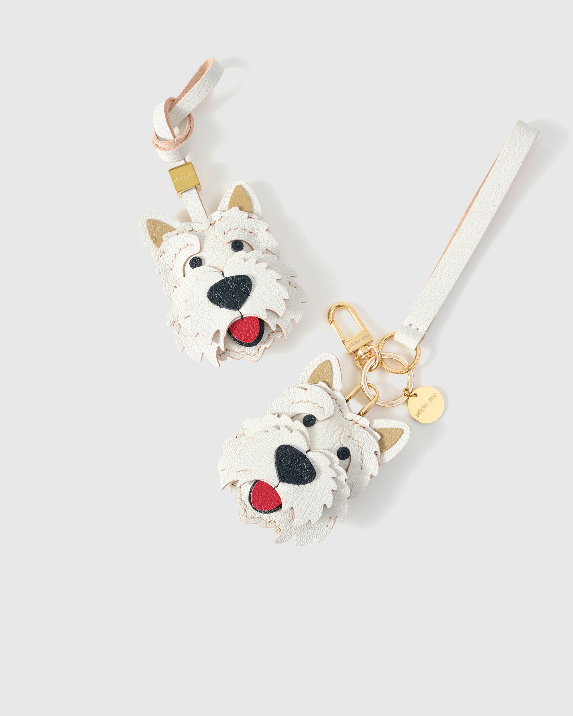 The WEST HIGHLAND WHITE TERRIER CHARM from STICKY ZOO® embodies cheerful sophistication—meticulously handmade from French Alran leather and shaped with layered fur appliqués. Designed to move seamlessly from bag charm to keychain, it celebrates the iconic Westie’s playful yet refined charm.
