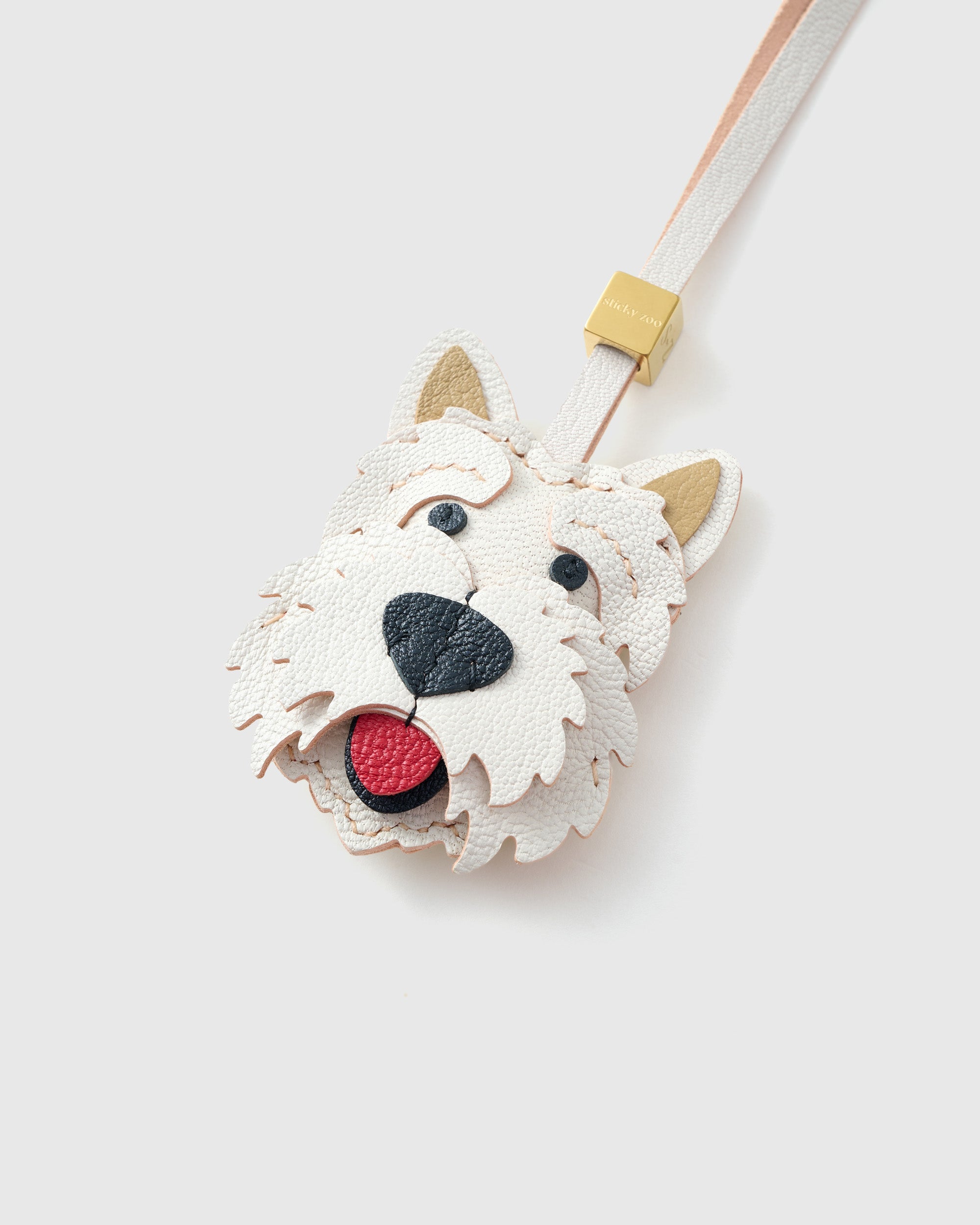 West Highland White Terrier — known for its soft white coat and lively spirit, brought to life through layered leather craftsmanship. With textured appliqué fur, a bold black nose, and a pop of red tongue, every detail captures its joyful expression.